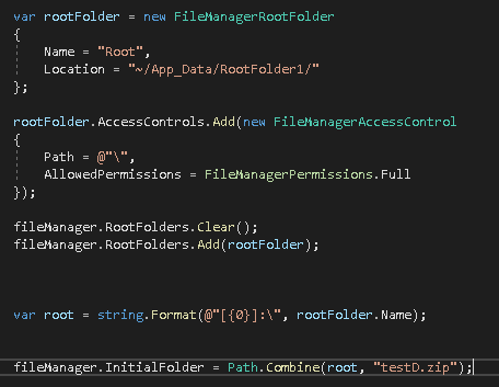fileManager.InitialFolder = @"[RootFolderName]:\SomeFolder\test.zip"; fileManager.InitialFolder = FileManagerRootFolder.GetFullPath(rootFolder.Name, @"SomeFolder\test.zip");