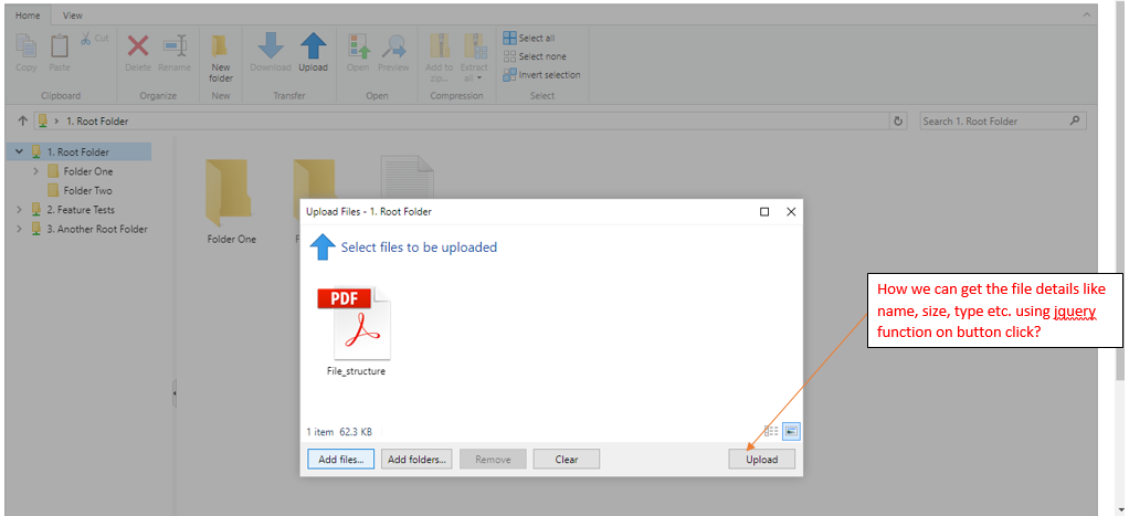 we have your Enterprise version(7.7.0). How we can get the file details like name, size, type etc. using jquery function on button click? and Before saving the file, Can we call another method please guide me.