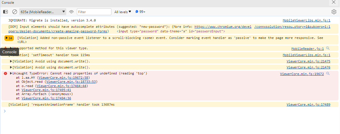 We are encountering an issue with our .NET web forms project using GleamTech.DocumentUltimate version 6.9.6. While we experience no errors on desktop, we face console errors on mobile devices. Document viewing is sometimes hindered, and the console error seems to originate from the JavaScript file, which we are struggling to resolve. I've attached images for reference.