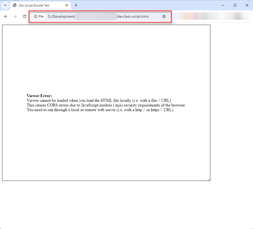 Improved: Show explanatory error message when DocumentViewer host page is opened via local HTML file:Viewer cannot be loaded when you load the HTML file locally (i.e. with a file:// URL).This causes CORS errors due to JavaScript module (.mjs) security requirements of the browser.You need to run through a local or remote web server (i.e. with a http:// or https:// URL).